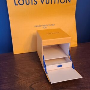 The always stylish Louis Vuitton box in vibrant orange. Features subtle blue detailing. Ideal for gifting, storing your jewelry or LV charms. The box fits the Louis Vuitton navy blue jewelry box (does not come with it). Love that this box also has a separate little drawer.
