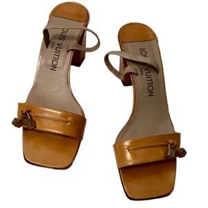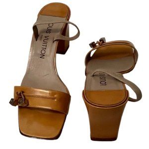 Louis Vuitton Gold Patent Leather 3" Block Heel Sandals Gold Tone Metal LV Logo Charms Size 36.65 (US 6)