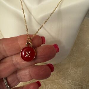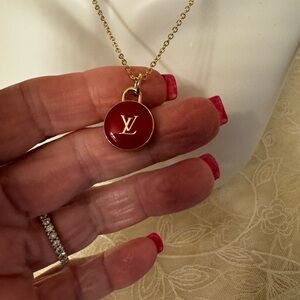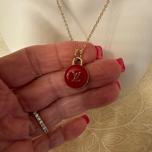 Chic Louis Vuitton necklace with a bold red pendant. Adds luxury to any look.