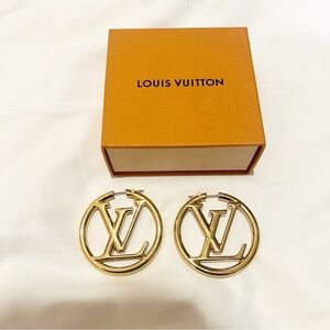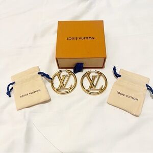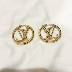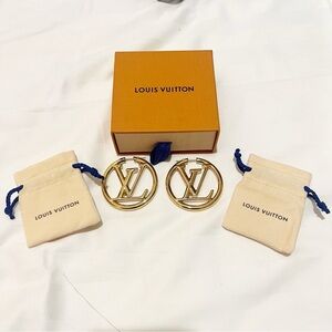 Elegant gently used gold earrings with iconic Louis Vuitton logo. Comes with branded pouches and box.
