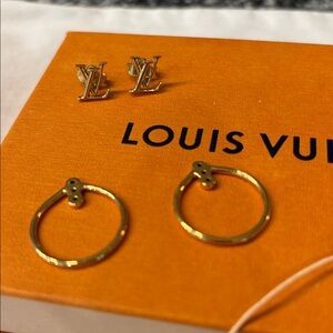 Louis Vuitton chic gold hoop earrings paired with iconic LV stud design. Stylish and versatile. Style number M00763.