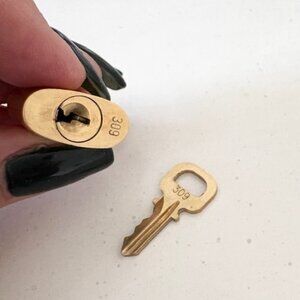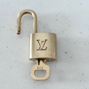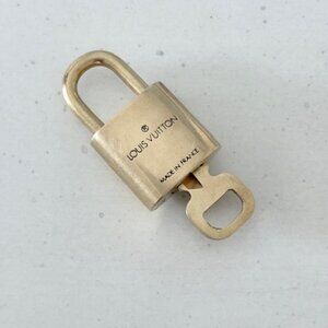 Elegant gold lock with matching key. Features iconic LV logo. Perfect for securing your valuables.