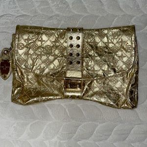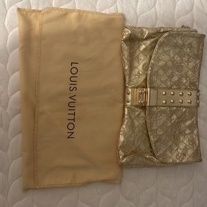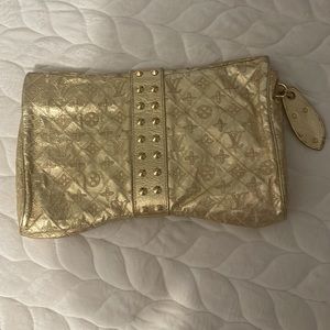 This is an authentic LOUIS VUITTON Limited Edition Coquette Clutch in Gold. This elegant clutch is finely crafted of gold Louis Vuitton shimmery monogram.