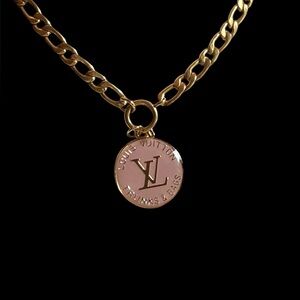 Stylish gold necklace with a pink medallion. Features Louis Vuitton emblem.