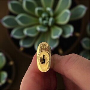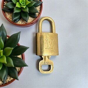 Elegant gold padlock with matching key. Features Louis Vuitton branding. Perfect for securing your valuables.