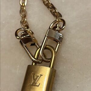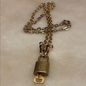 Elegant gold padlock & key featuring the iconic Louis Vuitton logo. Perfect for adding a touch of luxury to any outfit. Key and lock are #319. Unbranded necklace as a gift included.