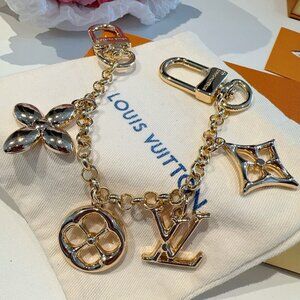Add a touch of opulence to your everyday essentials with this stunning Louis Vuitton keychain. Crafted with shiny gold - toned hardware, it features the brand's most recognizable motifs: a four - petal flower, a circular emblem, and the iconic "LV" initials. The double - clasp design offers versatility, allowing you to attach it to keys, bags, or even your favorite luggage.