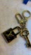 Stylish keychain set by Louis Vuitton. Features gold hardware with black LV logo accents. Includes lock and key charms.