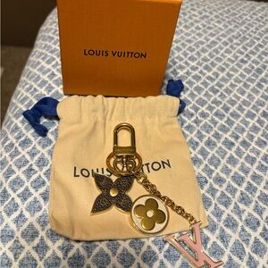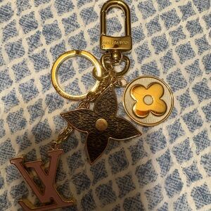 Chic Louis Vuitton key holder with floral charm. Gold and brown accents. Perfect for keys or bags.