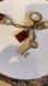 Chic Louis Vuitton key charm with gold and burgundy accents. Made in Italy. Features iconic lock and key vintage design.