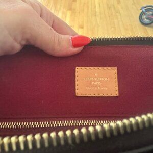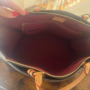 Made from Monogram canvas with natural-leather trim, its interior features a vivid red lining and a Louis Vuitton patch. The removable strap and top handles give carry options. 13.4 x 9.4 x 5.9 inches (length x Height x Width) Monogram coated canvas Textile lining Natural cowhide-leather trim Gold-color hardware 2 outside flat compartments Inside zipped pocket 2 inside flat pockets.