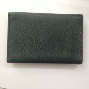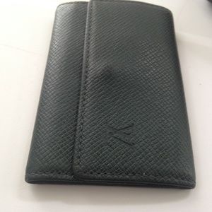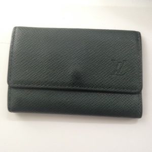 This is a pre-owned 6 hooks key case made of green taiga leather. This key case has a slot for folded bills, ID or Credit card. Folded it measures about 4.5 inches long and 3 inches wide. It is in good condition with minimal wear as shown in photos. It is marked: Louis Vuitton, Paris, Made in Spain. Date Code: CA0947.