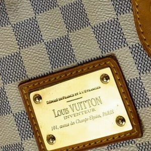 This Hampstead PM is a gorgeous open-top tote bag from Louis Vuitton crafted in Damier Azur coated canvas, The Hampstead PM, named after a London suburb, is quite roomy with expandable sides, is adorned with a hard golden "Louis Vuitton Inventeur plaque on the front of the bag.