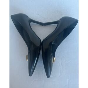 These high-heeled pumps are made of smooth calf leather and feature a pointed toe with a gold-tone V accent, which is a signature detail of Louis Vuitton.