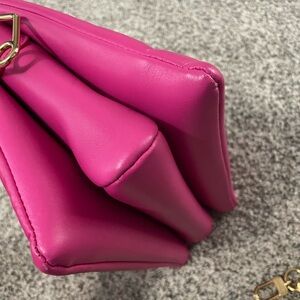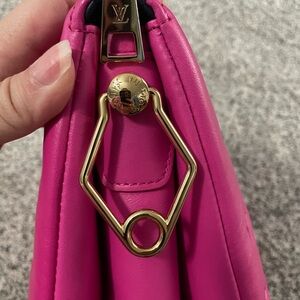 Chic Louis Vuitton bag in vibrant fuchsia. Features signature embossed design. Includes stylish chain and fabric straps.