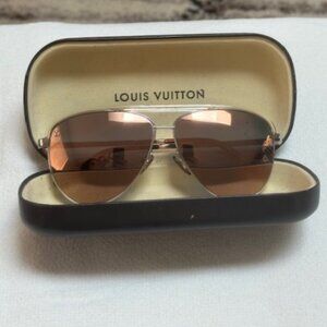 Stylish Louis Vuitton sunglasses. Silver frame with brown lenses. Elegant design for any occasion.