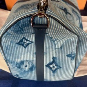 KEEPALL BANDOULIÈRE 50 NX266269132 Purchased on 3/31/2021 and is brand new never used. The luggage tag not shown does have my initials CCM can be with the bag or without. It is a watercolor denim fabric with leather trim. Shoulder strap, bag fastener in white, original lock and key, with UPC tag, and leather information tag. An amazing keepall size 50.