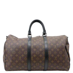 Experience the ultimate in luxury travel with the LOUIS VUITTON Keepall 45 Bandouliere Monogram Canvas Travel Bag in black and brown, featuring iconic Monogram Canvas canvas and sturdy leather trim. This spacious bag offers ample room for essentials and a sophisticated, timeless design.
