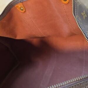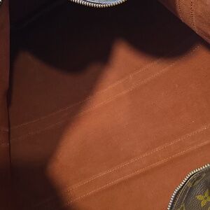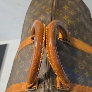 Stylish and durable, this Louis Vuitton keepall 50 travel bag features a classic brown monogram design. Perfect for travel or daily use. includes lock. zipper has been replaced. clean interior. see last pic for rubbing on canvas from storage.