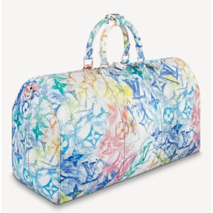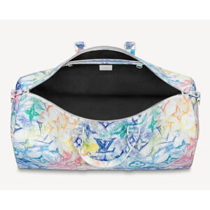 The Keepall 50 Bandoulière is made from coated canvas with a soft multicolor pastel print of the Monogram pattern, the colors evoking Virgil Abloh's iconic rainbow signature