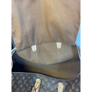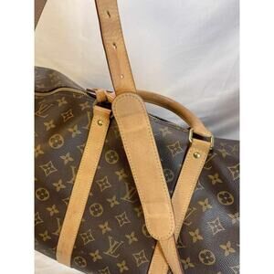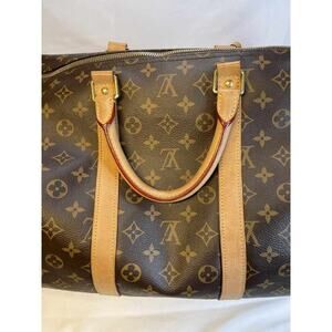 THE LOUIS VUITTON KEEPALL BANDOULIERE 55 MONOGRAM IS IN USED CONDITION. THE EXTERIOR OF THE BAG HAS SCUFFING. THE STRAPS HAVE STAINS AND SCUFFING. THE INTERIOR HAS SMALL STAIN INSIDE THE MAIN SECTION.