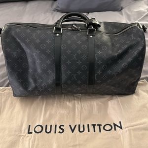 The beloved Keepall 55 Bandoulière now comes in our new iconic black and grey Monogram Eclipse canvas. Light, supple and always ready for immediate departure, the bag lives up to its name: those adept at the art of packing can easily fit a week's wardrobe into the generously sized (and cabin-friendly) Keepall 55.