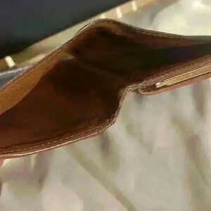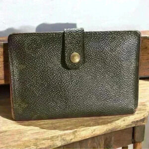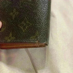 Used monogram wallet. Snap works wallet has some wear and cracks the corners. Please see pics. Inside has coin residue.