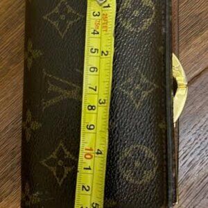 Very clean, no internal scrapes or marks in the billfold sleeve. No marks or tears on the outside. Please see photos for slight "curling" of the edges due to use, but no rips, tears and clasp and snap works perfectly with no issue, no smell-smoke free, pet free home. See measurements in the photos. And as always, complimentary gift with any purchase.