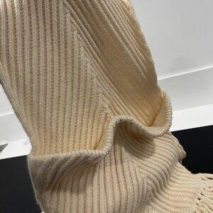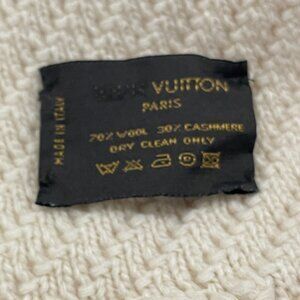 This creme wool blend knit Louis Vuitton Scarf with Pockets features fringe trim at ends. She is preloved so please take a moment to look at photos for condition. I do not see any stains. Overall good preloved condition. Scarf is 70% Wool and 30% Cashmere. The scarf is 92" in length including fringe and 10" wide. Please reach out for additional information.