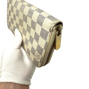 Authentic and in good preowned condition. There is some wear/minor cracking on corners as shown in photos. Some minor glaze wear around corners. The hardware has some come off of the gold tone as shown in photos. Zippers are working well. Cloth part around zipper does have some minor wear/staining as shown in photos. Interior is overall clean with no peeling. Many card slots as well as a zipper compartment which is functioning well. There are a few spots of wear here in there, but overall good condition inside. Some minor discoloration overall as is common with Damier Azure pieces. Tons of organization and room in this wallet!