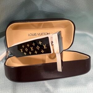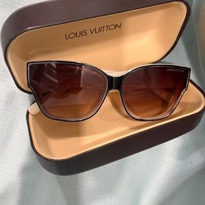 A classic shape and high-contrast colors. Their light, comfortable acetate frame features a graphic House signature on the temples. Cat eye style shape. Acetate frame. Gradient brown lenses. Monogram Elements signature. No scratches in very good condition. Comes with LV hard case
