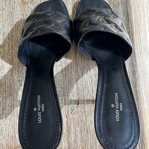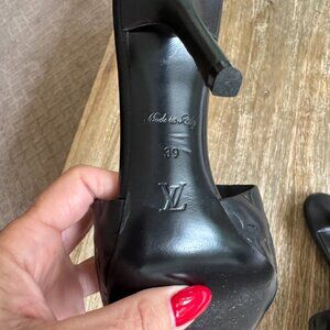 This is an authentic pair of LOUIS VUITTON Lambskin Embossed Monogram Revival High Heel Mules size 39 in Black. These stylish sandals are crafted of monogram embossed lambskin leather in black. They feature a 4-inch covered stiletto heel.