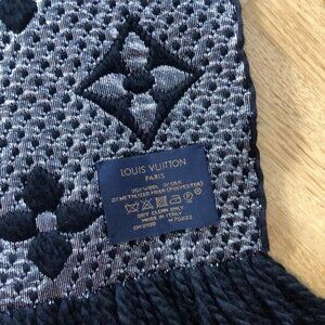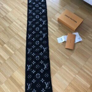 This chunky Louis Vuitton SCARF is black with silver LV monogram print. Perfect for everday wear and will
