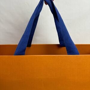 Great used condition! Large classic orange and blue gift bag with double strap cloth handles. Clean tan interior. Ribbon is in excellent condition. Minor imperfections shown in last photos. Great for storing an LV wallet or purse.