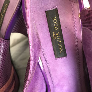 Elevate your footwear collection with these striking Louis Vuitton Leather Printed Slingback Pumps in a vibrant purple hue. Crafted from high-quality leather, these pumps boast an elegant silhouette complemented by a chic slingback design that effortlessly combines style with comfort. The eye-catching print adds a touch of artistic flair, making them a perfect choice for both casual outings and formal occasions. With a classic pointed toe and a practical heel, these pumps not only enhance your look but also provide all-day wearability, making them a must-have addition to any fashionista's wardrobe. Step out in confidence and let your shoes do the talking!