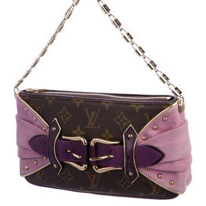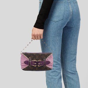 "RARE", Louis Vuitton Les Extraordinaires Pochette from the Spring Summer 2004 Les Extraordinaires Collection. Truly a Blast from the Past, this small clutch is draped in pink suede goatskin and trimmed with a purple ostrich. Lined in luxurious pink satin detailed with rivets, huge buckles, and brass LV padlock strap.