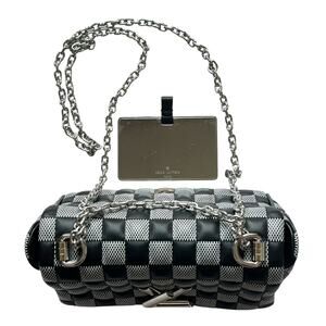 Description: French technique of 3D optical illusion, large LV twist closure, matching mirror, black leather interior, checkerboard leather exterior, silver hardware, one flat pocket inside