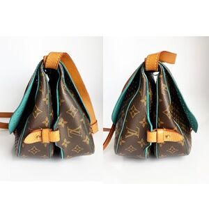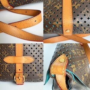Crafted from coated Monogram canvas with natural vachetta leather trim, it features diamond-shaped perforations, turquoise Alcantara lining, and turquoise-dyed edges for a fresh, sporty twist. Finished with gold-tone hardware and an adjustable leather strap for versatile crossbody or shoulder wear.