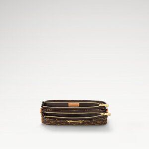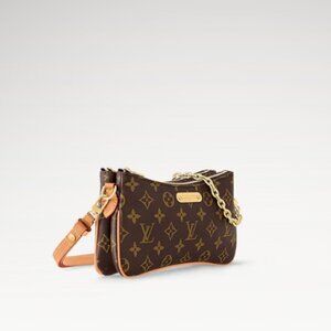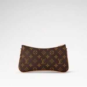 This LV Pochette handbag is made of Monogram canvas and can be carried on the arm. It comes with a detachable gold chain strap and a removable, length-adjustable shoulder strap made of the brand's signature natural cowhide, allowing it to be worn as a handbag or over the shoulder. The bag features a sturdy double zipper design and is adorned with a gold-engraved plaque, adding distinctive detail to its stylish design. Size 24.5 x 13.5 x 6.5 CM
