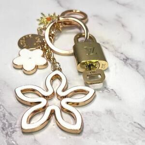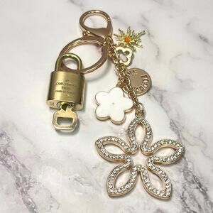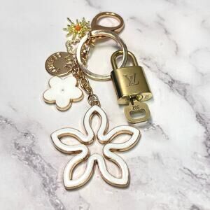 Louis Vuitton Lock & Key #302 w/ a White & Rhinestone Floral Charm Keychain