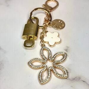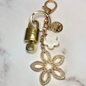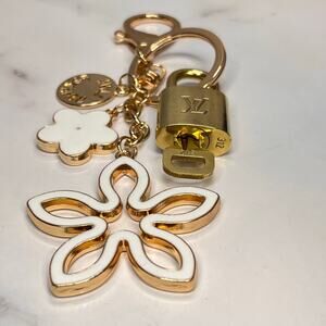 Authentic Louis Vuitton Lock & Key Set #312 in working condition. The lock shows minor surface scratches/scuff from normal use. Paired with a brand new unbranded gold-tone keychain featuring white enamel floral charms—perfect as a keyring or bag charm!
