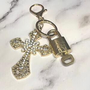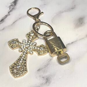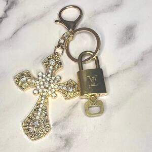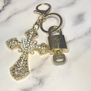 Louis Vuitton Lock & Key Set #300 w/ a Gold-Tone Rhinestone Cross Charm Keychain