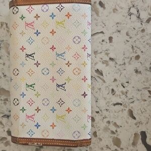 This Louis Vuitton Murakami long wallet features a vibrant multicolor design on a cream background. Perfect for adding a touch of luxury to your everyday essentials.