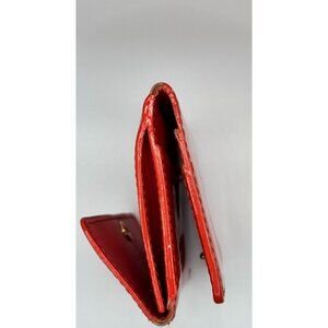This Louis Vuitton wallet showcases the brand's signature monogram embossed on red vernis leather. Spot on back and slight corner wear with coin area wear. The snap closure ensures security and ease of use.
