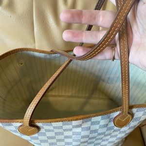 Light pen stains in bottom of bag, beautiful patina on leather straps, does not come with box