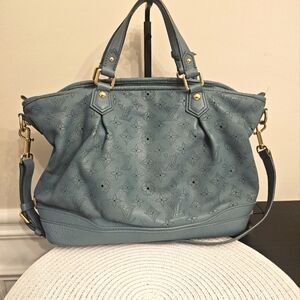Elegant and roomy Louis Vuitton Cirrus PM crafted in luxe Mahina perforated leather in a stunning soft blue shade. Features gold-tone hardware, dual top handles, and a detachable shoulder strap.