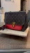 Elegant Louis Vuitton bag with iconic monogram pattern. Features striking red leather front pocket and gold-tone lock. Comes with shoulder strap and COA