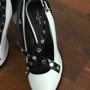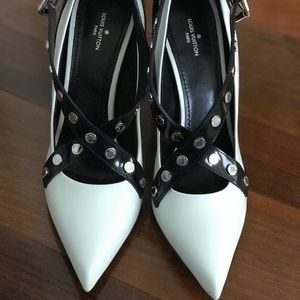 Never worn Louis Vuitton Match Make Cross Pumps Size 9. Made with black and white calf leather. These shoes stood out to me with its angular heel and cross straps, decorated with Louis Vuitton-engraved silver-tone studs. Calls for a chic look indeed! #ItsALook