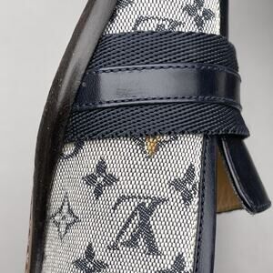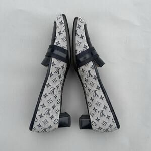 Elevate your fashion game with these stunning Louis Vuitton mules in a beautiful combination of navy and grey. Crafted from high-quality leather and fabric, these mules are a perfect addition to any stylish woman's shoe collection. The monogram pattern adds a touch of elegance and sophistication, making these mules perfect for any occasion.