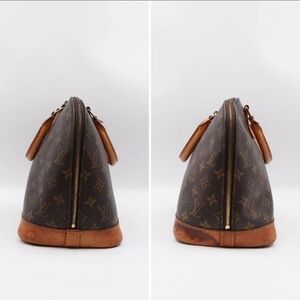 Elegant Louis Vuitton handbag in monogram canvas. Features brown and tan colors with leather handles.